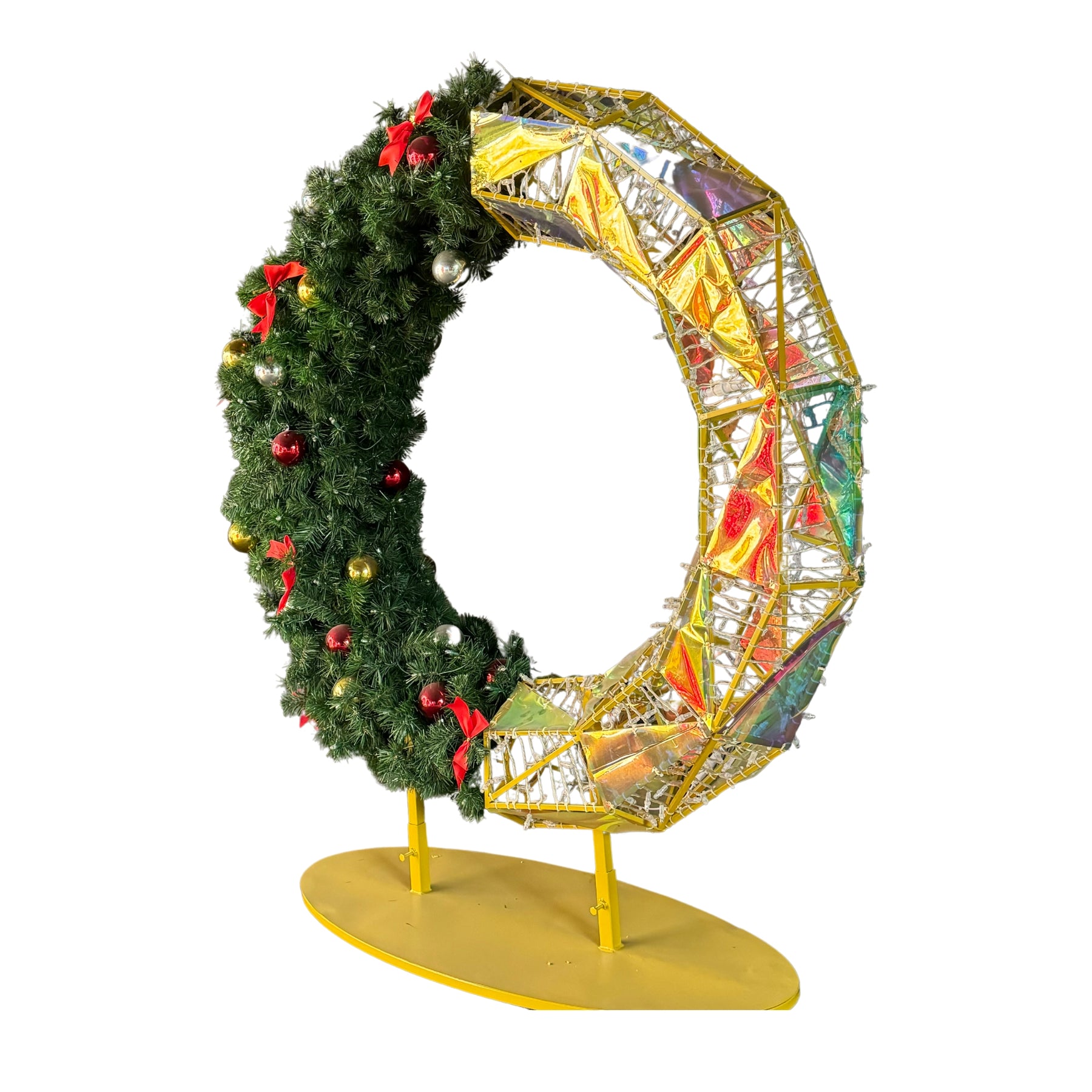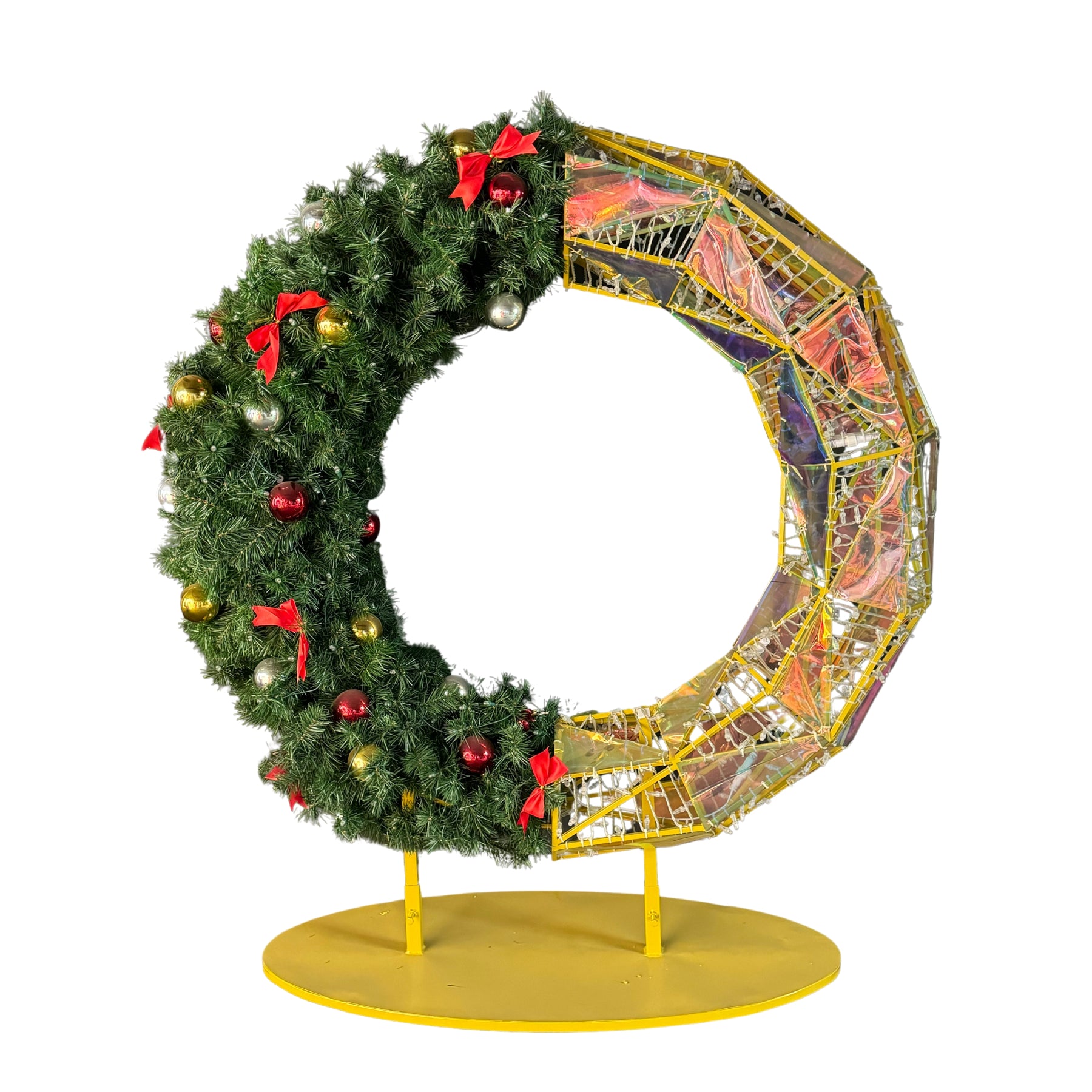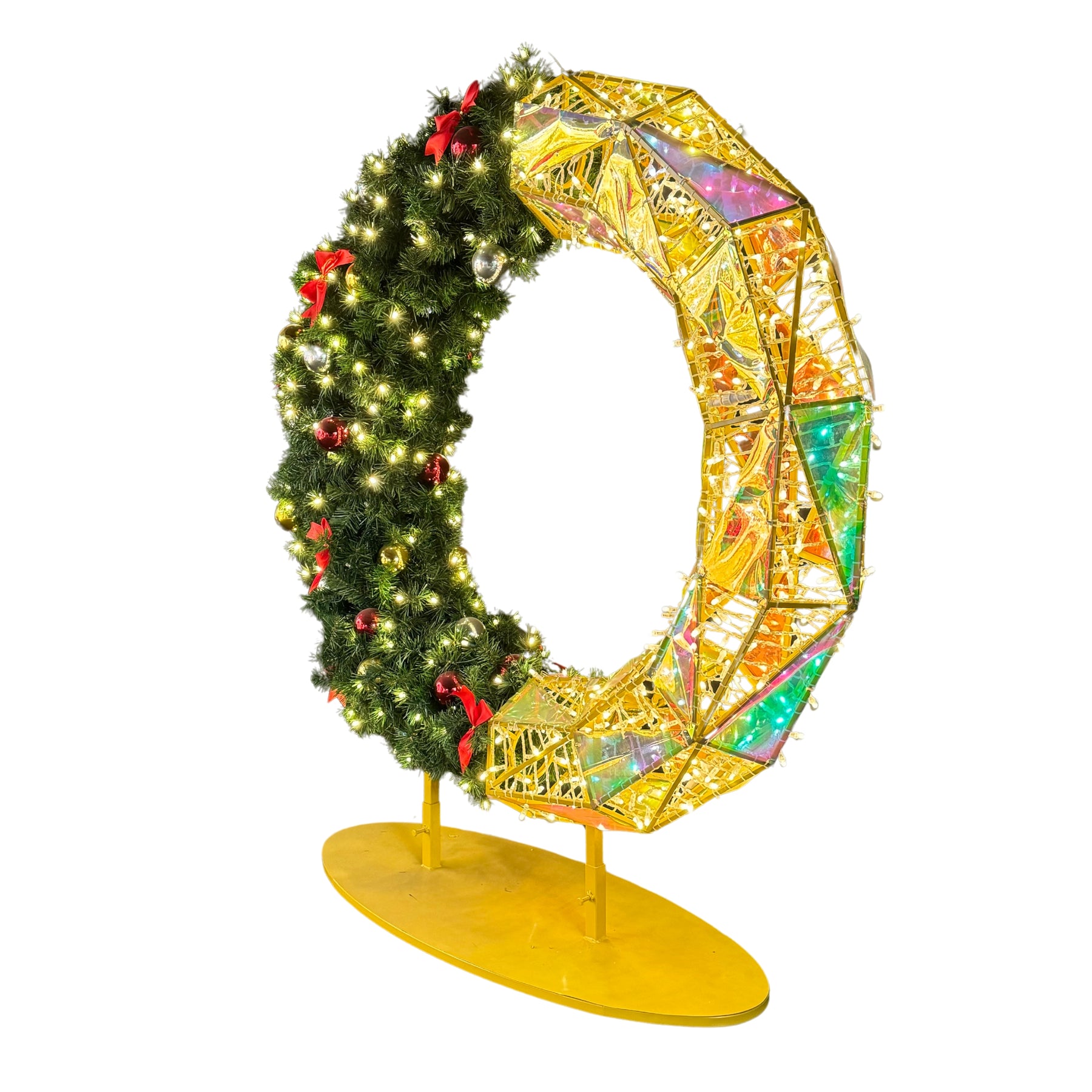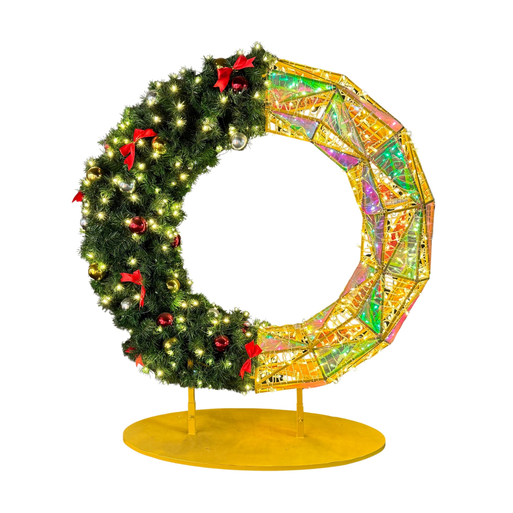 Get ready to add some whimsy to your holiday decor with our Giant Prismatic Iridescent Pre-Lit LED wreath! This oversized, elegant large wreath is perfect for commercial or municipal use, and its bright LED lights will make a unique statement. Perfect for both indoor and outdoor use.