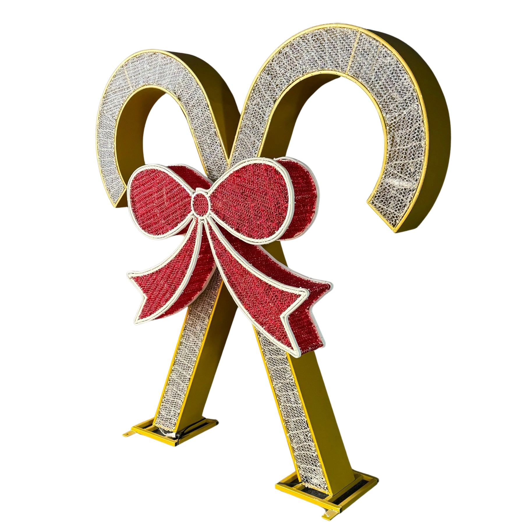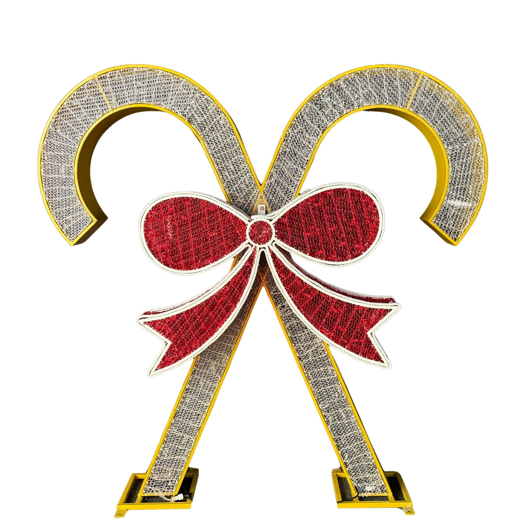 These Giant pre-lit LED candy canes wrapped in a bow add a touch of warmth and festivity to any holiday event. With a classic red and warm white design and elegant bow, they are equally charming both indoors and outdoors. Perfect for Christmas events, parties, municipalities or residential.